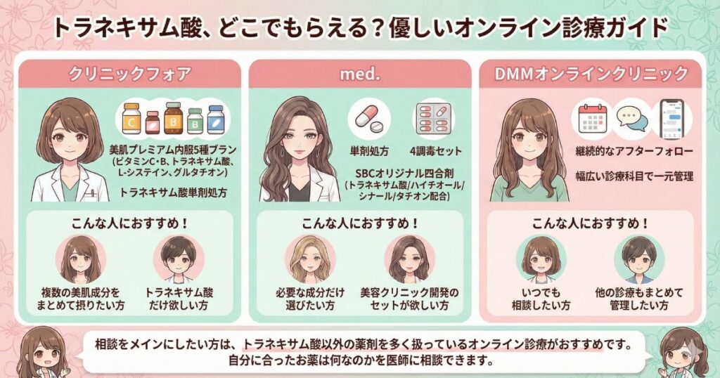 - トラネキサム酸はDMMオンラインクリニックやmed.など様々なオンライン診療で対応